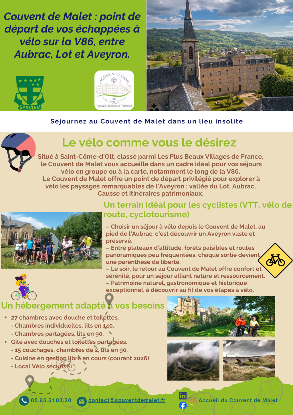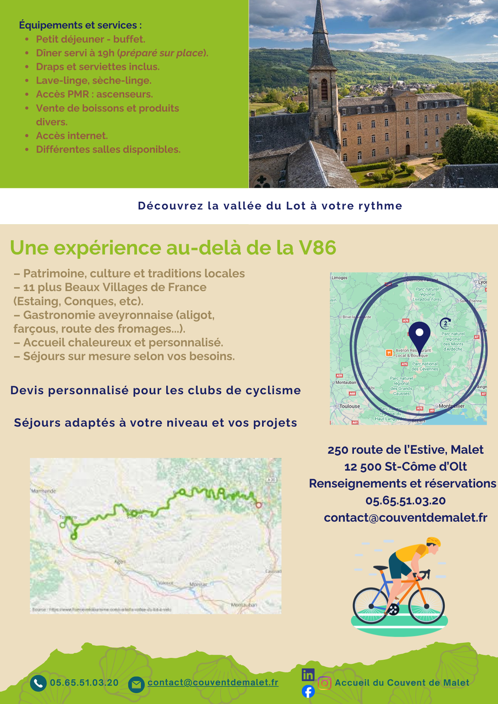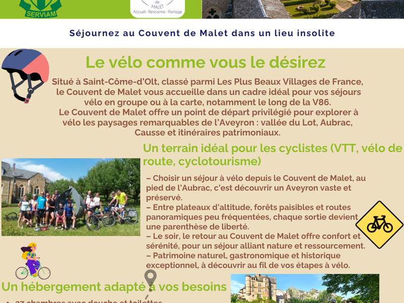 Couvent de Malet : point de départ de vos échappées à vélo sur la V86, entre Aubrac, Lot et Aveyron. Après la randonnée, place au vélo ! Découvrez notre toute nouvelle plaquette et lancez-vous dans une aventure sportive au grand air ! Partager 26 février 2026